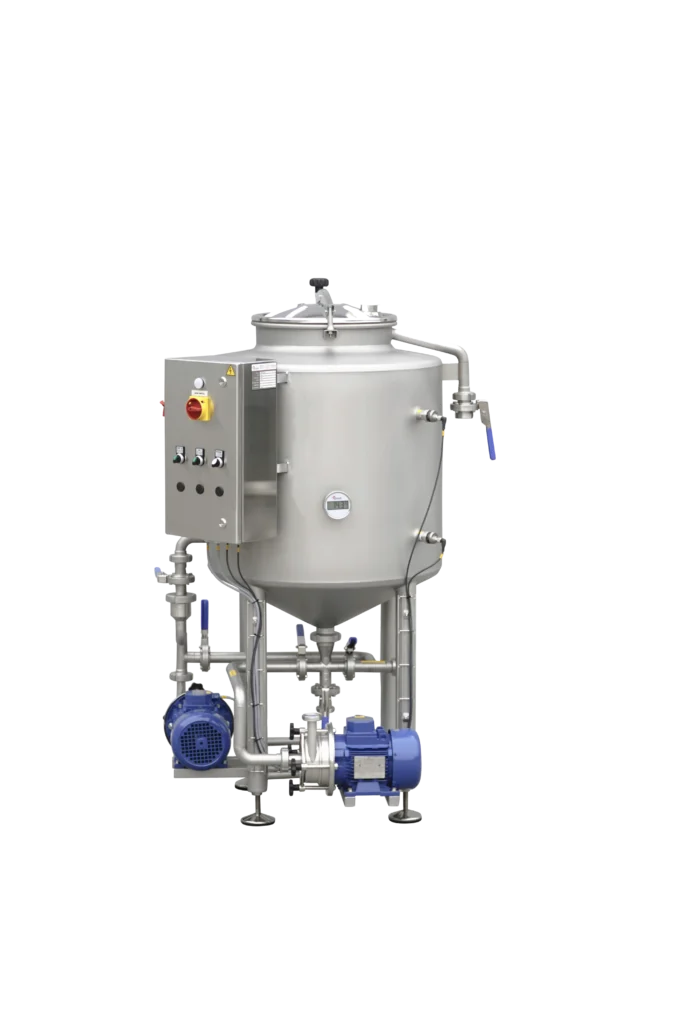 - Zásobník produktu 200 L so snímačmi hladiny, CIP systémom a čerpadlom produktu