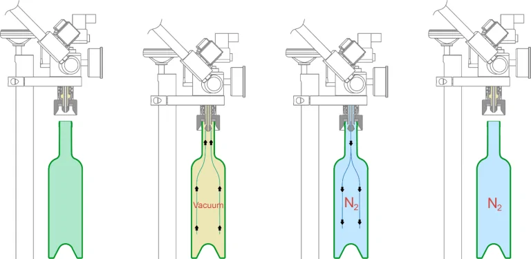 Systém nie je vhodný pre PET fľaše, pretože by mohlo dôjsť k ich deformácii vplyvom silného vákua. Fľaša je umiestnená pod deaerátor, ktorý na ňu zostupuje. Vysokovýkonná vákuová pumpa odstráni väčšinu vzduchu z fľaše, aby bolo možné vstreknúť inertný plyn, zvyčajne dusík. Jednotka je vybavená systémom „no bottle — no injection“, ktorý zastaví deaeračný proces v prípade neprítomnosti fľaše.