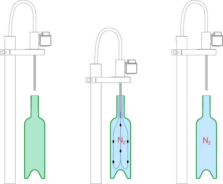 Fľaša je umiestnená pod jednotku inertizácie, ktorá na ňu zostupuje a vstrekne do prázdnej fľaše inertný plyn (zvyčajne dusík). Jednotka je vybavená systémom „no bottle — no injection“, takže deaeračný proces prebieha iba v prípade, ak je fľaša prítomná.