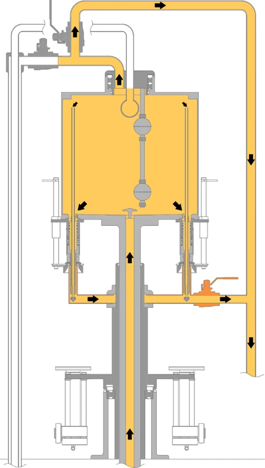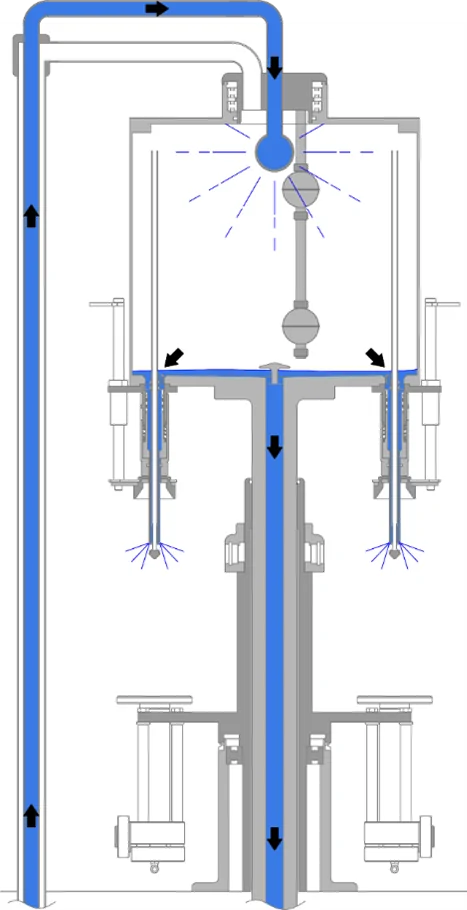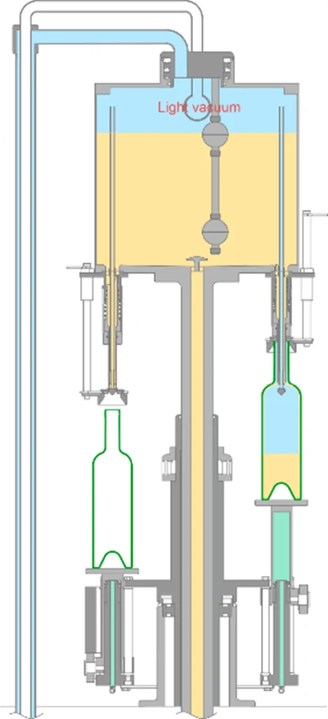 Fľaša je prepravovaná na plniacu pozíciu plniacej veže, pozostávajúcu z pneumatických zdvíhacích piestov fliaš a gravitačného plniaceho ventilu. Piest zdvihne fľašu a otvorí plniaci ventil pritlačením hrdla fľaše na gumové sedlo ventilu, čím sa vytvorí uzavretý a tesný systém. Ľahké vákuum v plniacej nádrži odsaje vzduch z fľaše a vyprázdni odvetrávaciu trubicu plniaceho ventilu pre rýchlejší štart plniaceho procesu. Keď fľaša dosiahne prednastavenú úroveň plnenia, piest sa spustí a fľaša je dopravovaná z veže pomocou hviezdicového kolesa.