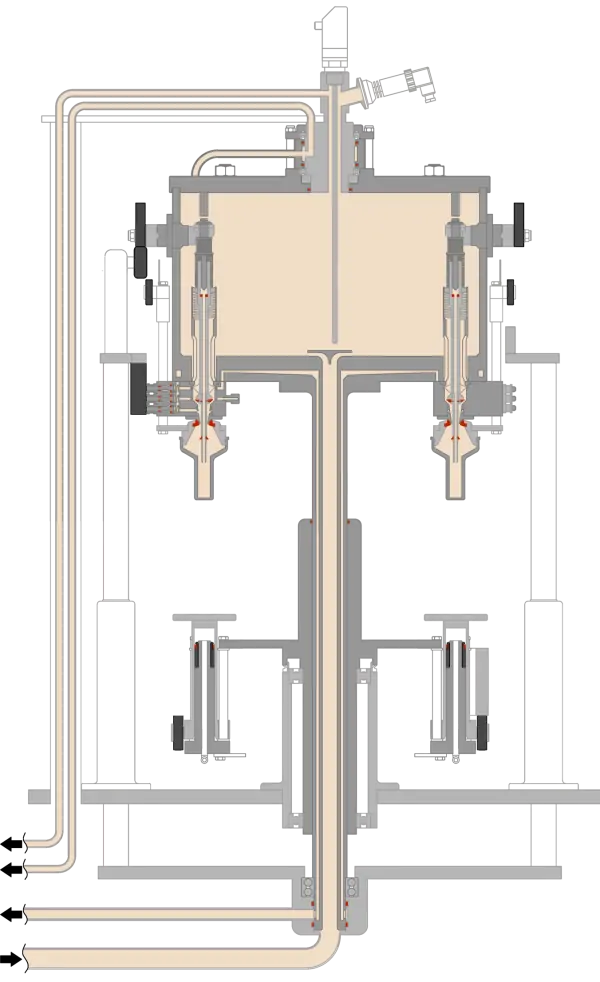 • Plniaca tlaková nádrž s prívodom produktu odspodu a s prstencovými komorami pre CO₂ a stlačený vzduch, ktoré privádzajú plyny do plniaceho ventilu.