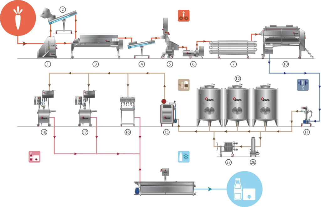 Zariadenia SRAML na spracovanie zeleniny, špeciálne navrhnuté na výrobu cviklovej a mrkvovej šťavy, vykonávajú všetky kroky spracovania s maximálnou efektivitou, pričom zabezpečujú rýchle a bezpečné spracovanie citlivej suroviny a dosiahnutie vysokej kvality produktu.