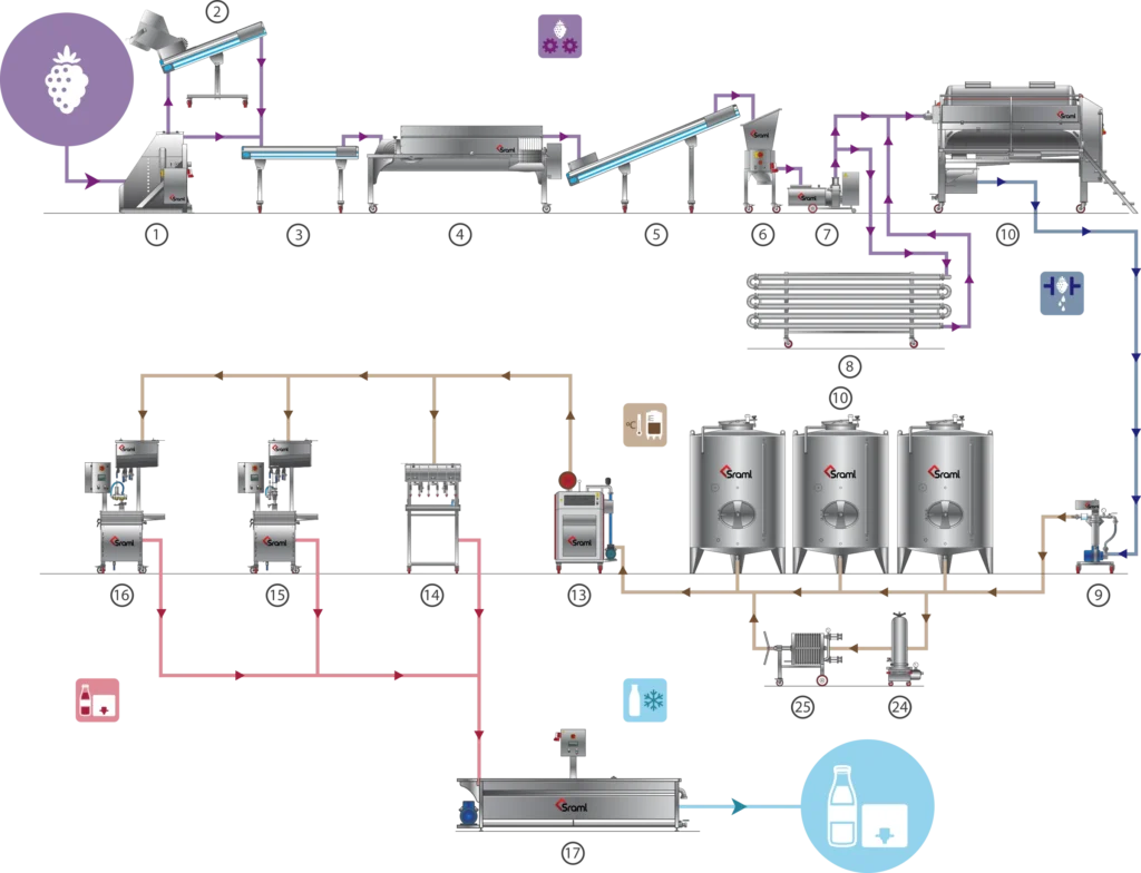 Okrem toho, že vám pomáha vykonávať všetky kroky spracovania štiav z bobuľového ovocia s maximálnou efektivitou, SRAML vám poskytuje výhody najnovších dostupných technológií v tejto oblasti.