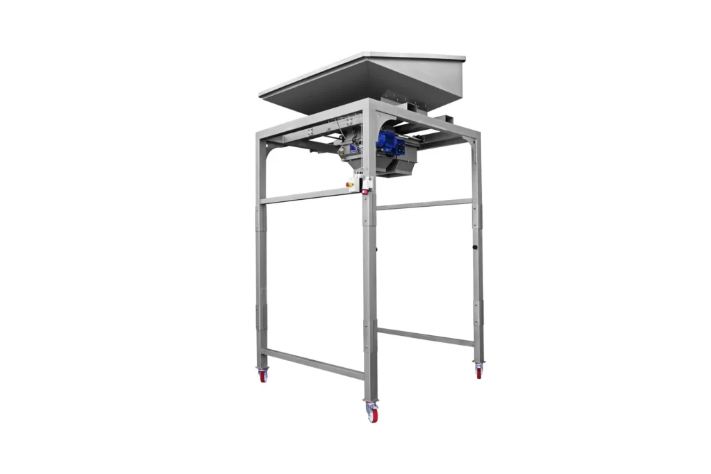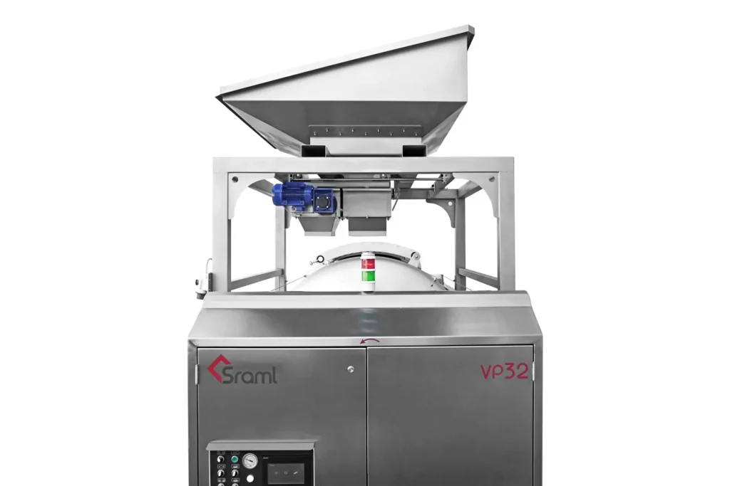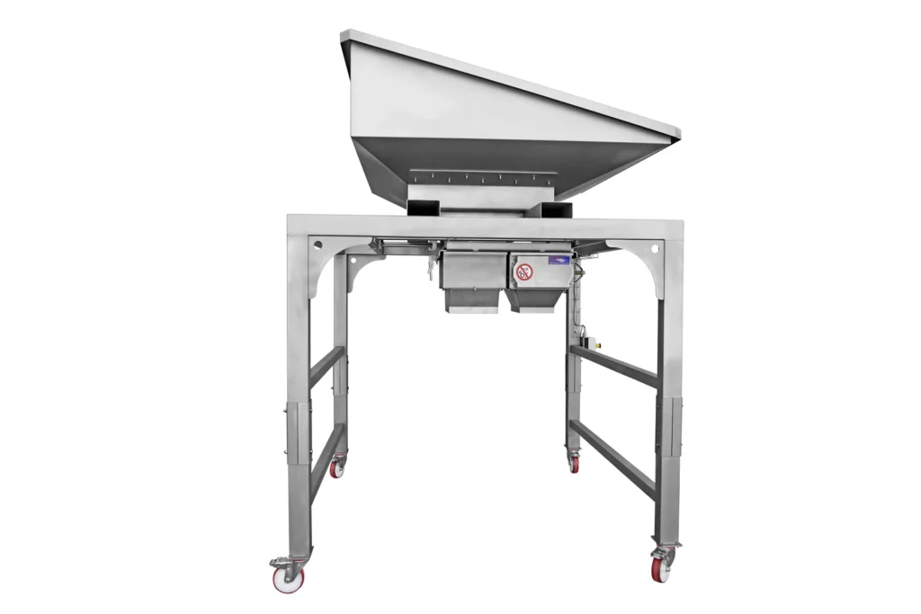 Násypka a mlecia jednotka, navrhnutá na uľahčenie plnenia lisu, plní lis priamo prijímaním hrozna z výklopných nádob, bez rozptyľovania alebo poškodenia ovocia a zároveň umožňuje pomletie strapcov alebo bobúľ, aby sa pred lisovaním uvoľnila šťava a dužina.
