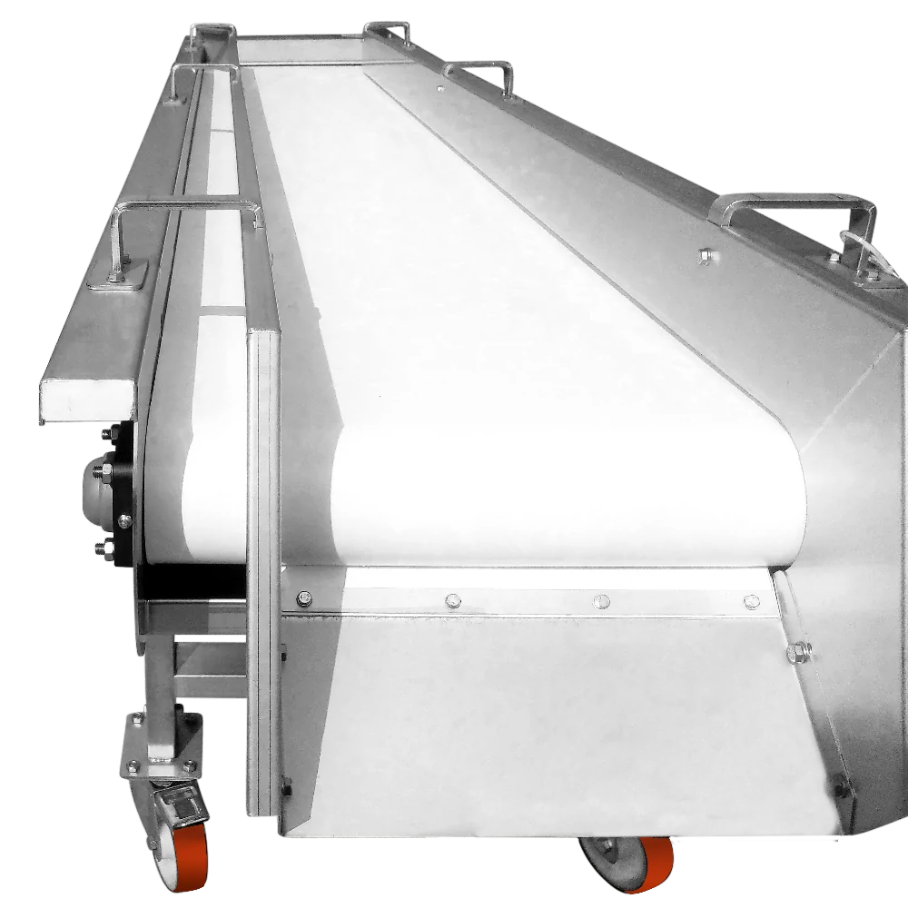 • Plne umývateľný triediaci pásový dopravník, dodávaný so škrabkou na dôkladné vnútorné čistenie pásu