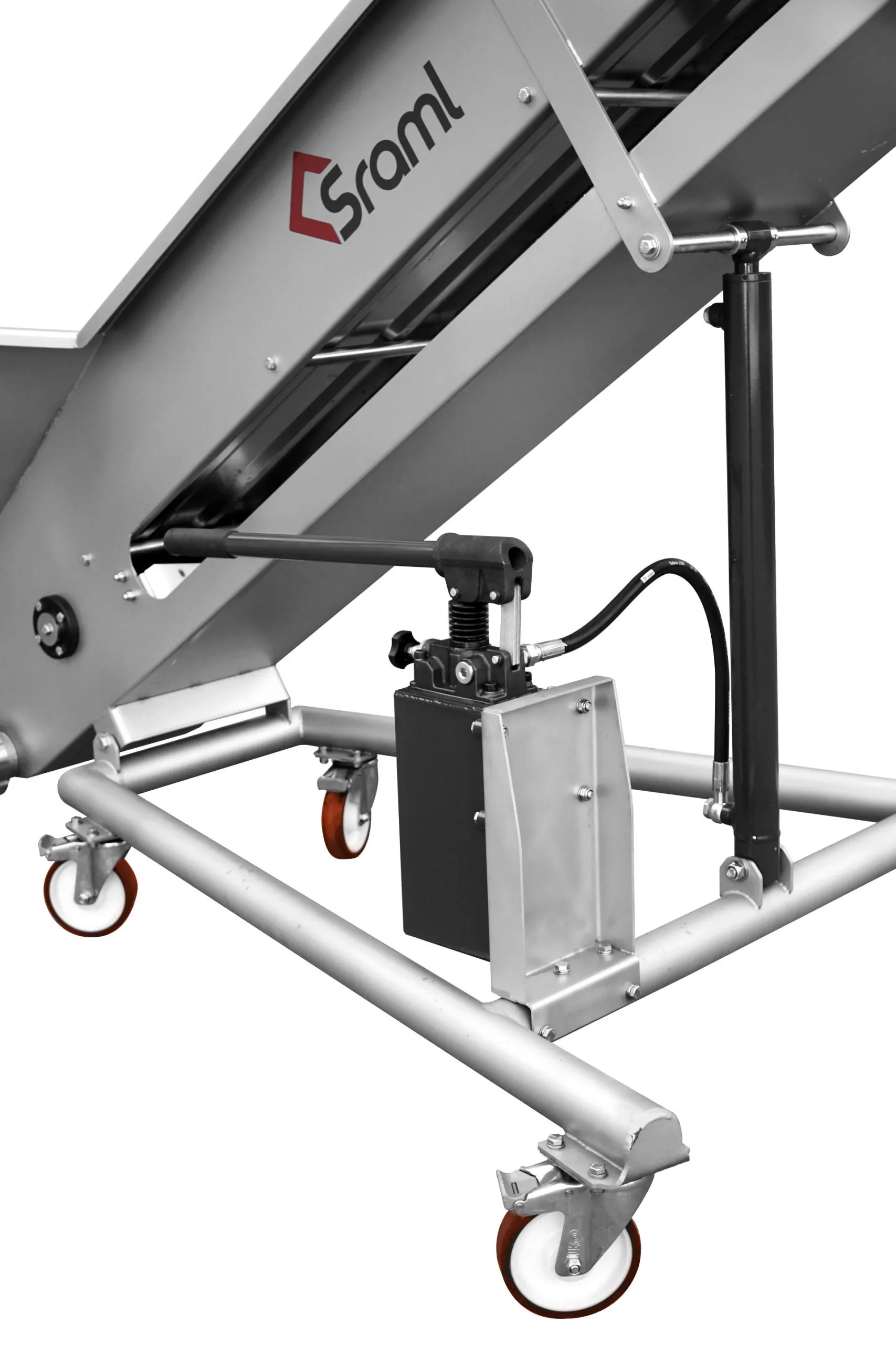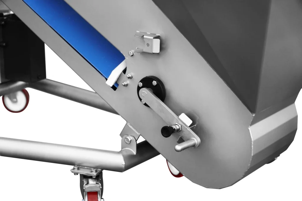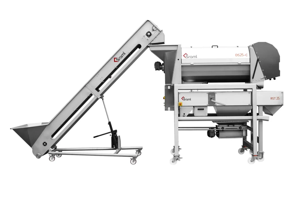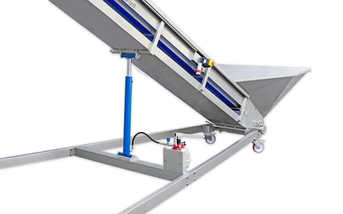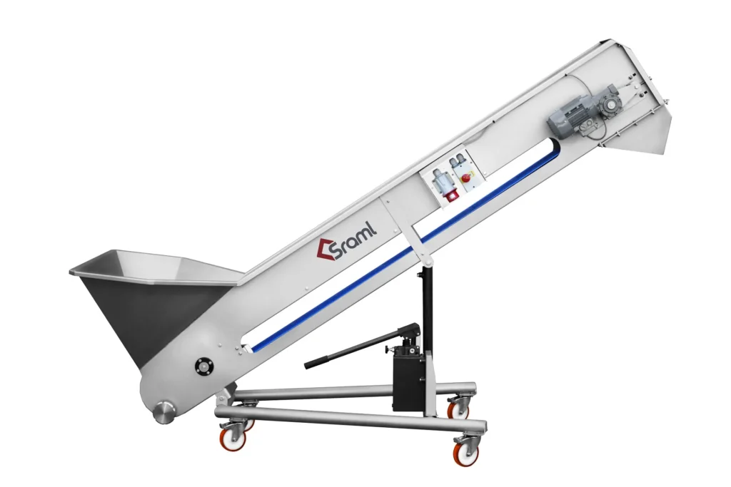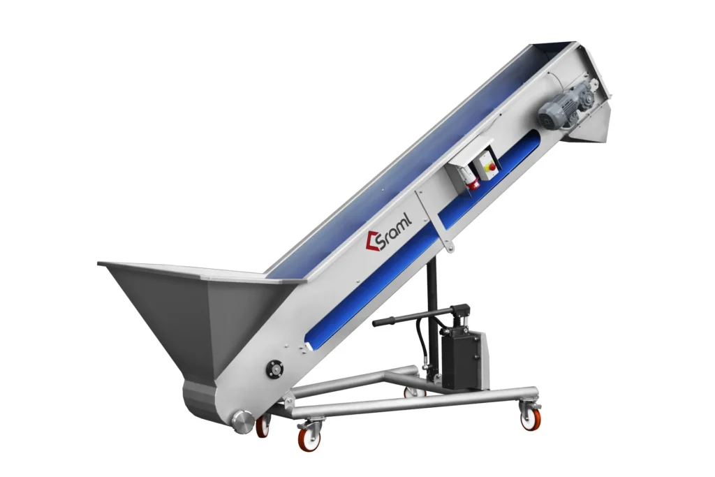 Pásové dopravníky na hrozno SRAML GBE, ktoré sa zvyčajne umiestňujú pred triediacim stolom, odstopkovačom alebo lisom, efektívne a šetrne prepravujú hrozno nahor k určenému spracovateľskému stroju, zatiaľ čo sa odkvapkaná šťava zhromažďuje v nádrži pripojenej k dopravníku.